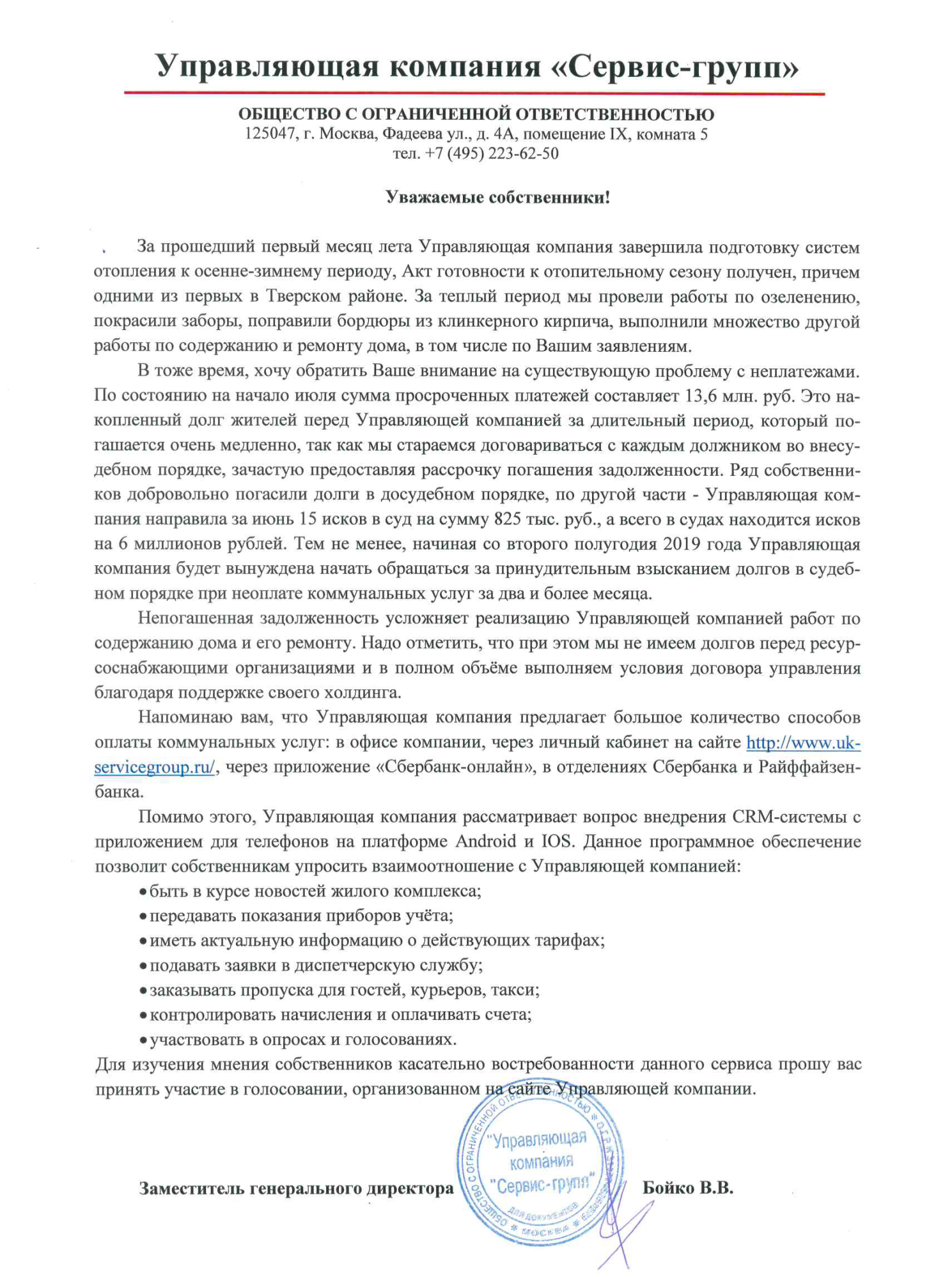 О работе УК с задолженностью в июне и расмотрении вопроса создания мобильного приложения для смартфонов собственников.